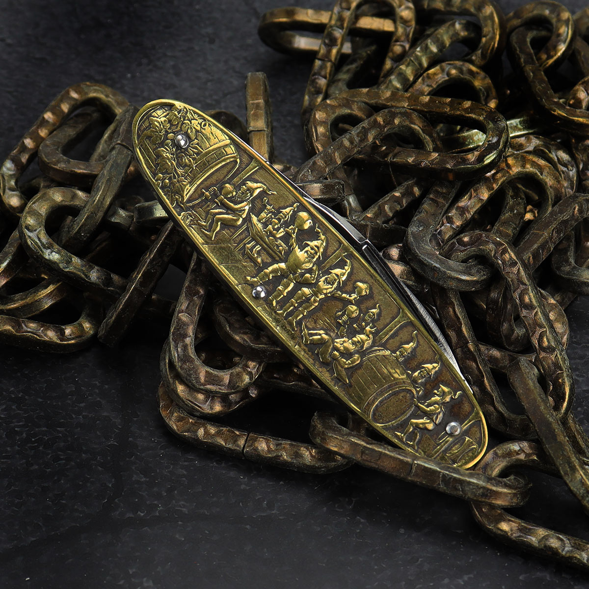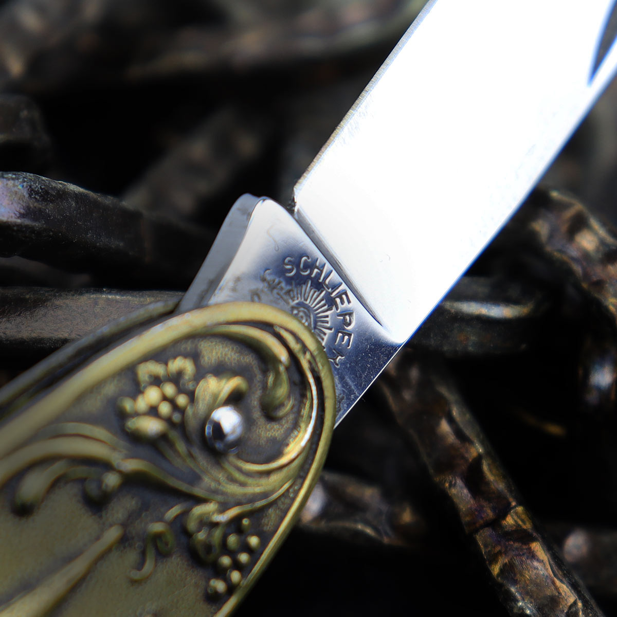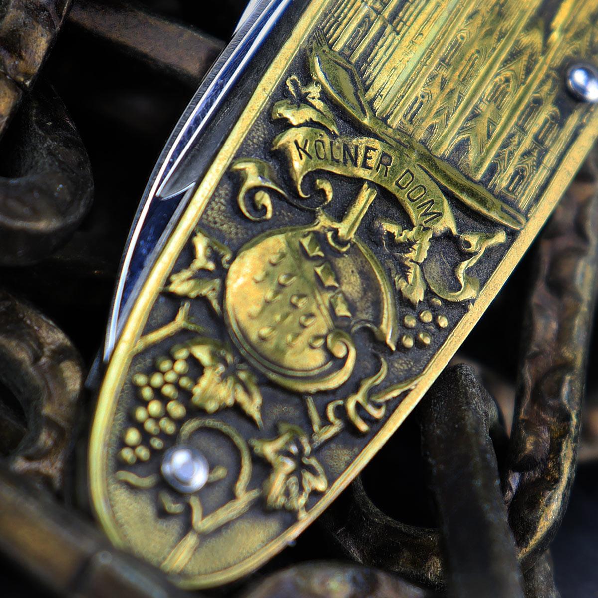 In den ganzen jahren habe ich dieses alte Herrenmesser mit einer Klinge von Schlieper "Eye Brand" nur einmal gesehen. Die Klinigen wurden in den 60iger der Blütezeit Solingens gefertigt. Als Prägeschalung wurde hier ein Motiv des "Kölner Doms" genutzt.