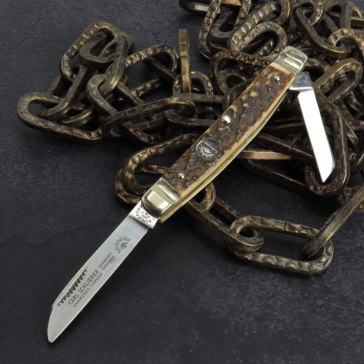 Altes Carl Schlieper "Eye Brand" 2tlg Congress Taschenmesser mit Hirschhorn