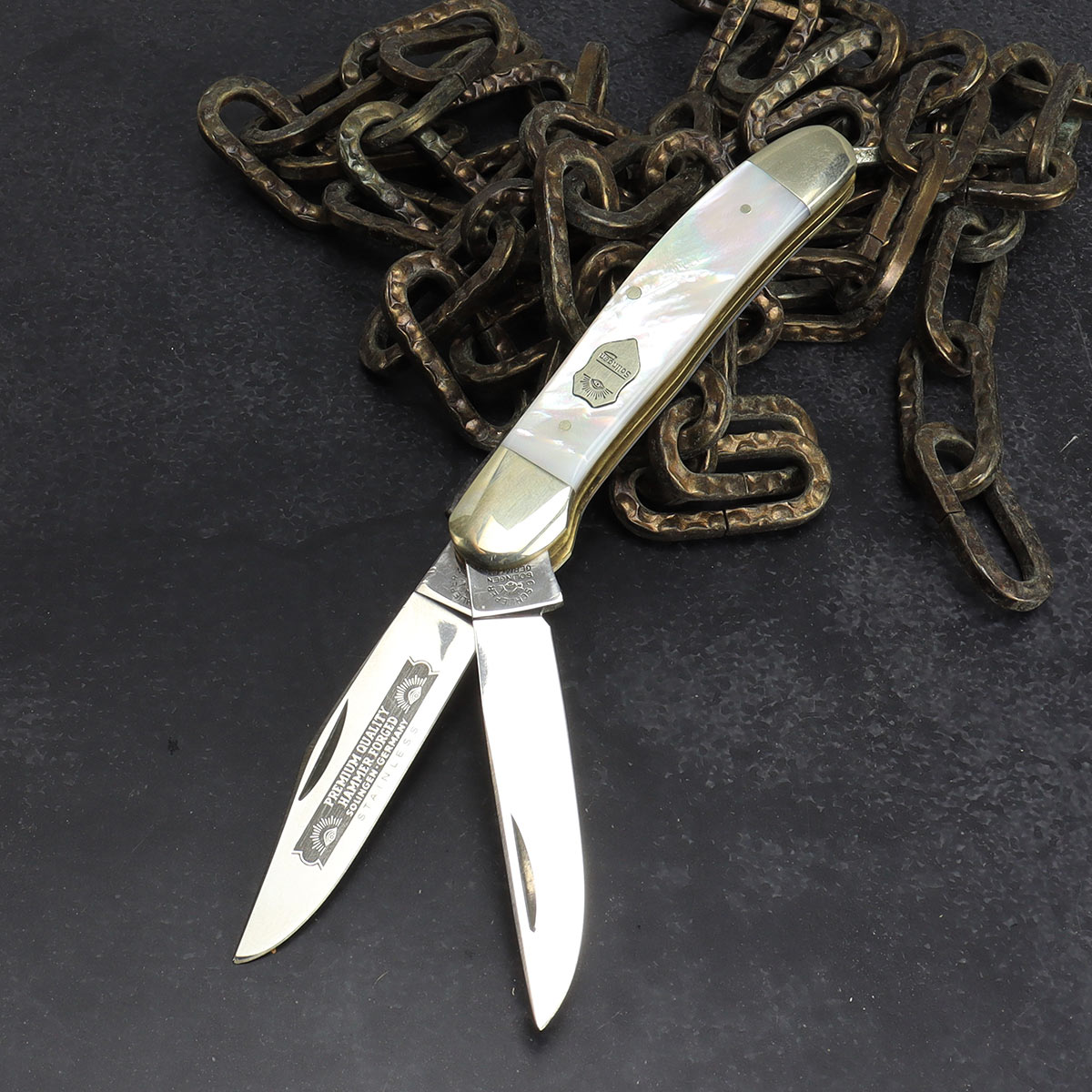 Altes Carl Schlieper GXSSP "Eye Brand" Copperhead 2tlg Taschenmesser mit Abalone Premium Quality