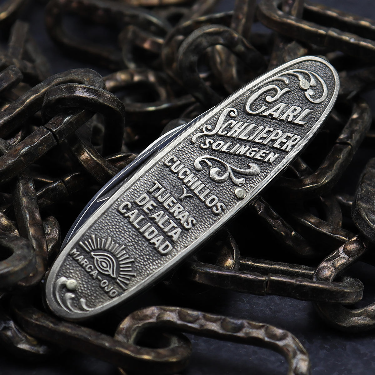 Freunde von alten Solinger Taschenmessern mit Geschichte kommen jetzt voll auf Ihre "Kosten". Hier biete ich euch ein altes Herrenmesser mit Metall-Prägeschalen der Firma Carl Schlieper an. Die Hauptklinge ist mit Schlieper "Eye brand" gestempelt.Dieses alte Schlieper-Messer mit der Prägung "Cuchillos y Tijeras de alta calidad" ist ein solides, in Solingen hergestelltes Klappmesser, das für den spanischsprachigen Markt produziert wurde. Der Aufdruck ist Spanisch und bedeutet übersetzt „Messer und Scheren von hoher Qualität“. Es handelt sich dabei um ein typisches Werbemerkmal der Firma Carl Schlieper, um die hohe Qualität des Solinger Handwerks zu betonen.