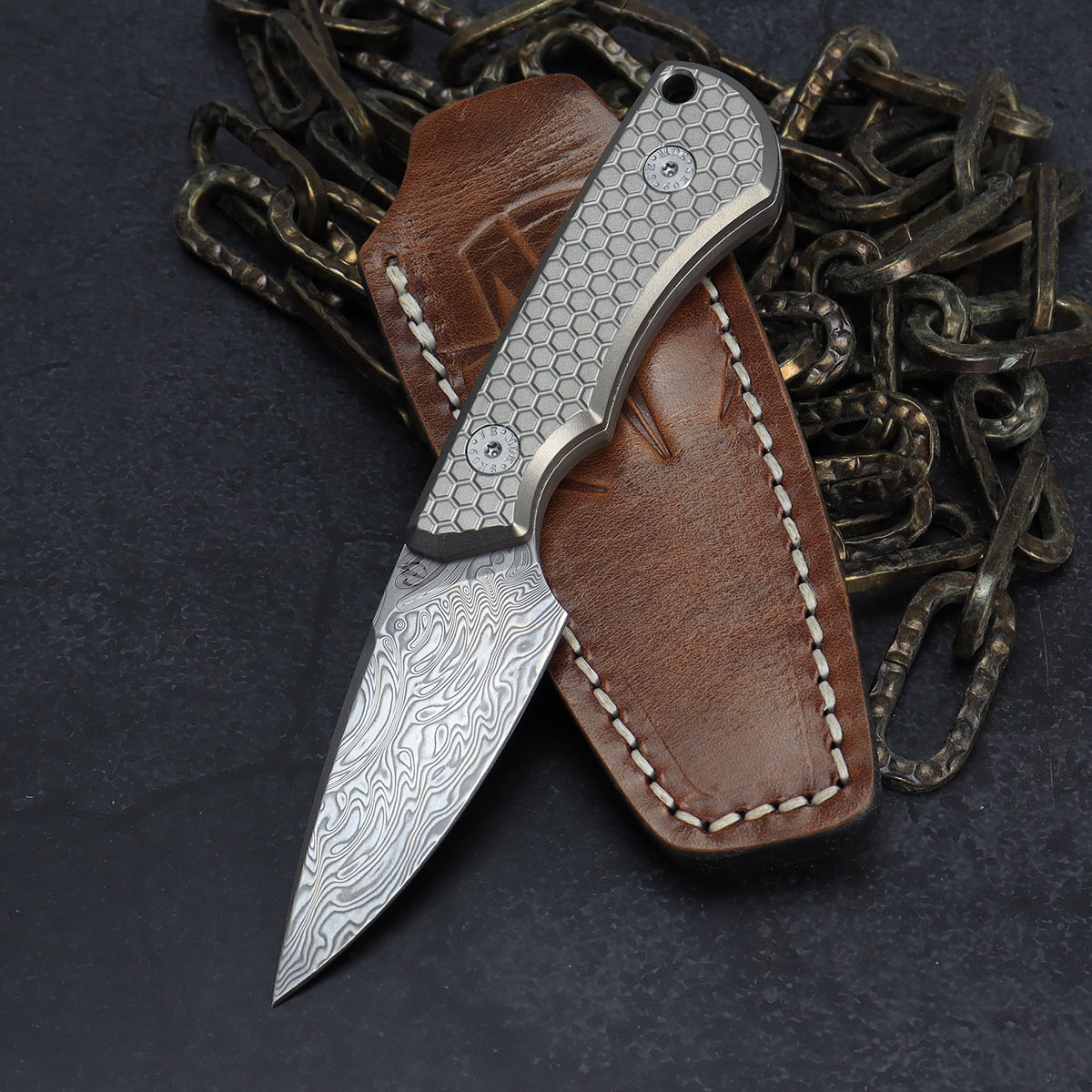 Prototyp SK09 Damast Auspicious mit Titan Honeycomb Scales und Lederscheide