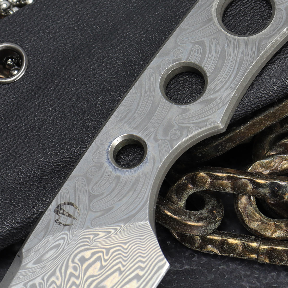 Im Bereich der vordersten Bohrung ist ein Ätzfehler-.Jetzt gibt es das beliebte SK09-Naked in einer Damastversion. Dieses feststehende Messer ist der ideale tägliche Begleiter mit einer erstklassigen Verarbeitung. Im Online Shop bieten wir dieses SK09 in unterschiedlichen Damastversionen an. So kannst du dir dein Messer bestellen wie es du dir wünschst. Dieses EDC Messer wird mit einer passgenauen Kydex ausgeliefert. Du kannst aber auch eine passende Messer Lederscheide separat dazu bestellen.
